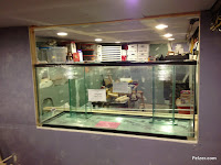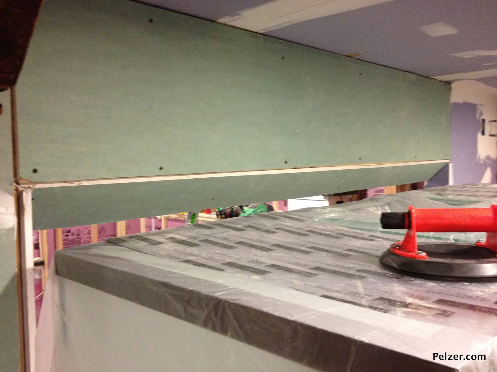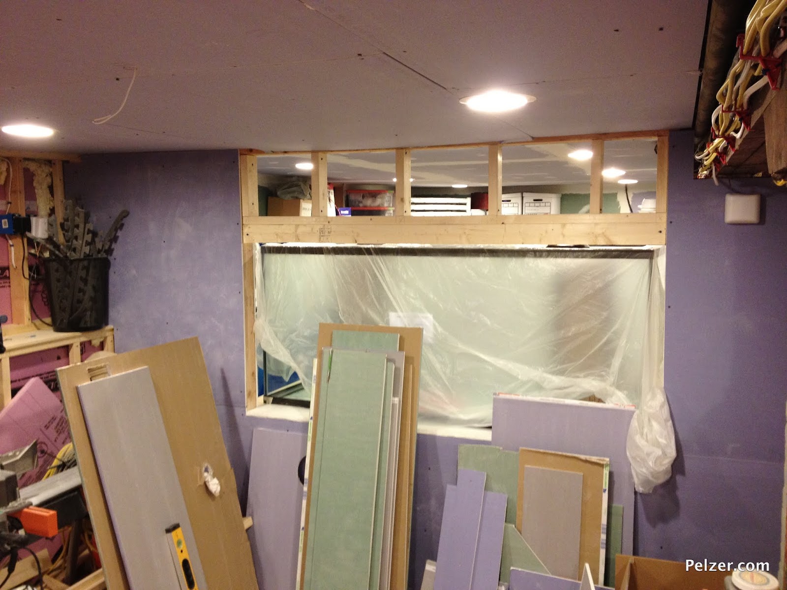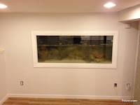 Once the tank was physically in place, I began building the wall above the tank. I didn't want the wall to impede the lighting entering the tank, so I built the bottom of the wall at an angle, shown below in various stages of being built and drywalled:
