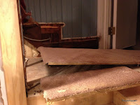 In that second (top right) image, you can see the carpet ramp and the painted/unpainted shadows of the two steps I had to remove from the basement stairs to allow the tank to enter the building. Prior to ordering the tank I'd made a mockup with the same dimensions, and moved it from outside to inside, and dimensionally, it worked. However, I did not take the weight into account, and it wasn't possible to move the tank through the same motions when the real day came. Live and learn there. The third image (bottom left) is the tank sitting half on the ledge of the foundation wall, half on a 2x4 brace I'd made for just this purpose, as a staging step prior to the last push, getting the tank onto the stand (last picture).